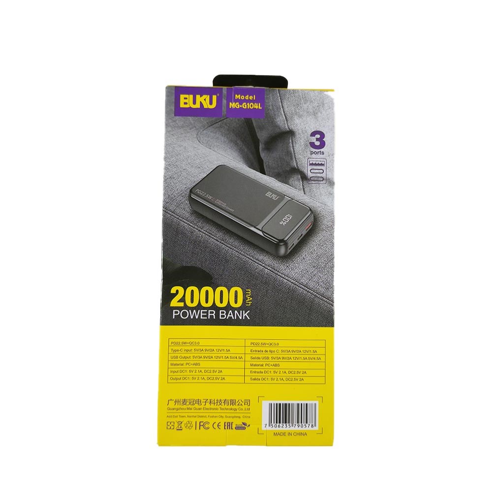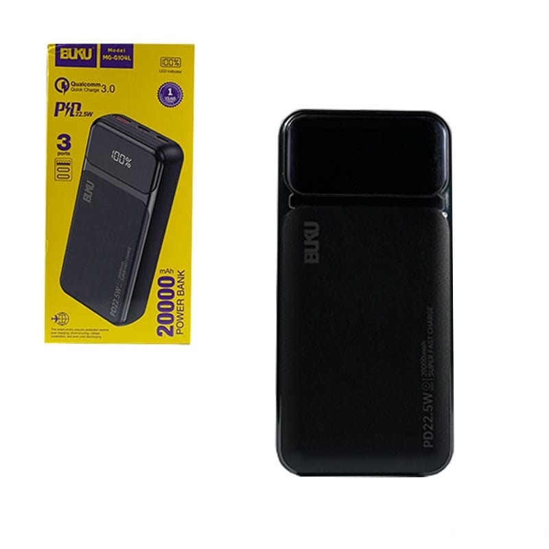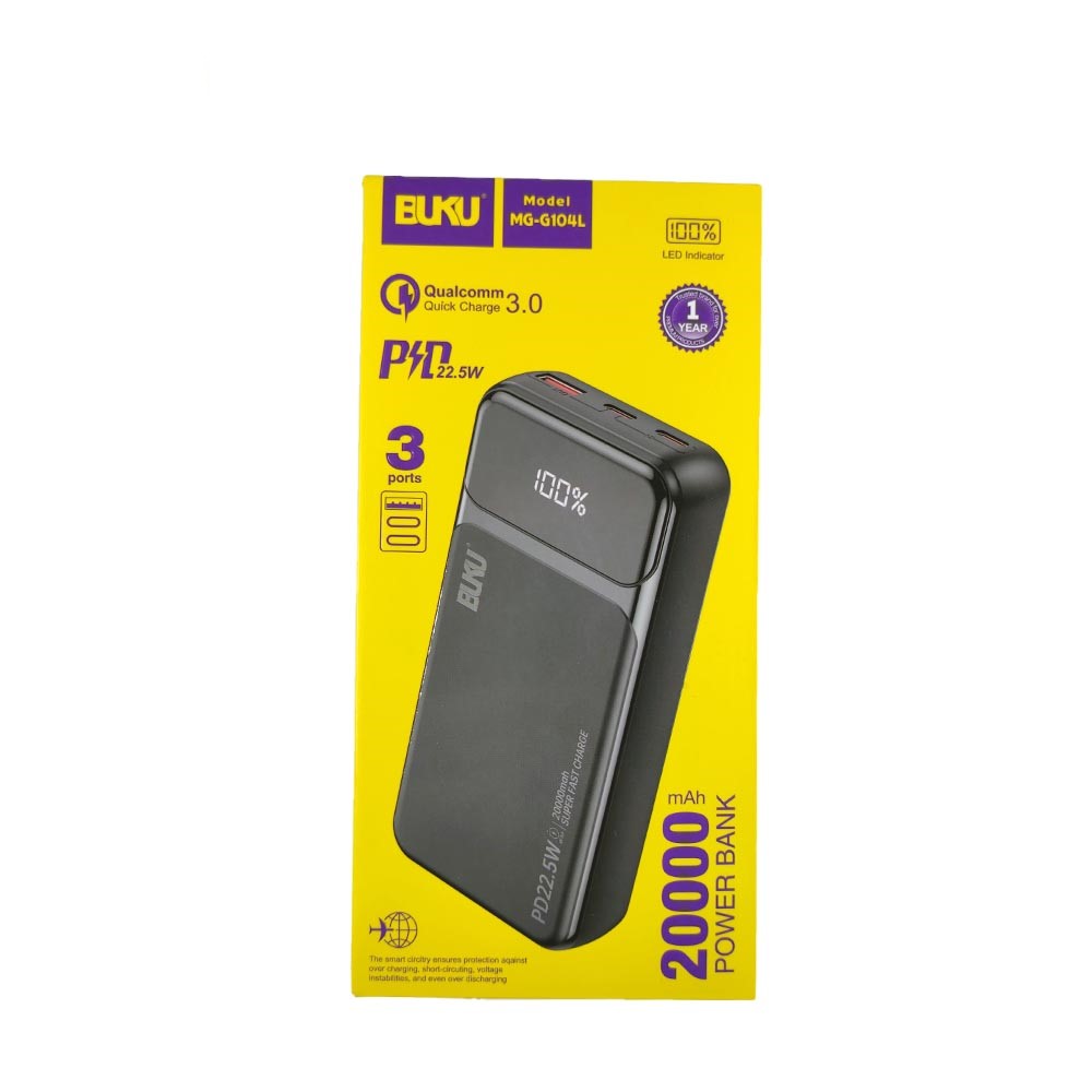 پاوربانک شارژ سریع BUKU مدل MG-G104L با ظرفیت 20000 میلی آمپر ساعت یکی از محصولات محبوب و موثر در بازار لوازم جانبی موبایل می باشد. این پاوربانک با طراحی زیبا و بدنه PC + ABS در برابر ضربه و خط و خش بسیار مقاوم است. و برای استفاده روزانه و سفرهای کوتاه بسیار مناسب بوده.