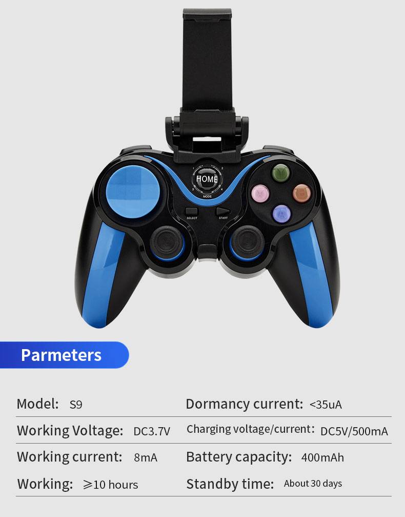 دسته بازی S9 وسیله ای خوش قیمت و کاربری برای دوست داران بازی های موبایل می باشد که با قیمتی اقتصادی و متریالی مطلوب ارائه می شود. بدنه این وسیله با ترکیب رنگ آبی و مشکی ظاهری مدرن به خود گرفته و با بهره مندی از متریال پلاستیک سخت و سیلیکون می تواند نوید استحکام هرچه بیشتر در برابر فشار و ضربات ناگهانی را بدهد. طراحی استاندارد و طبق ارگونومیک دست موجب شده تا دسترسی به تمامی کلید ها در سریع ترین زمان ممکن صورت گیرد و در استفاده های طولانی موجب خستگی دست کاربر نشود. هولدر گوشی نیز که روی دسته قرار دارد و به سمت بالا باز می شود با گوشی های حداکثر ۹۵ میلی متری سازگار است و با طراحی مناسب خود مانع از آسیب رسیدن به قاب پشتی گوشی می شود.